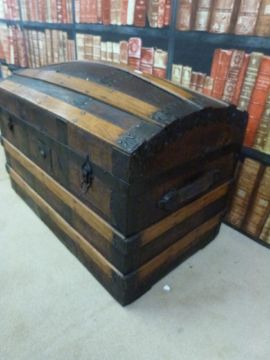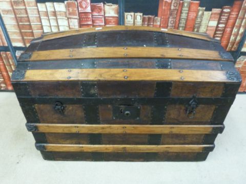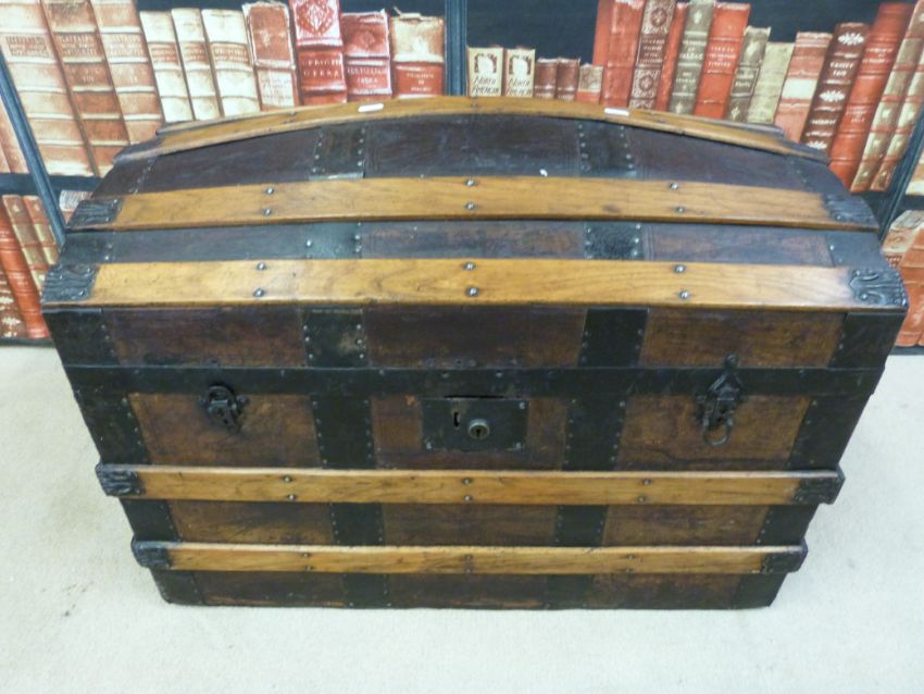 A 19thC metal and ash bound domed trunk with leather carrying handles (68cm long x 45cm wide)