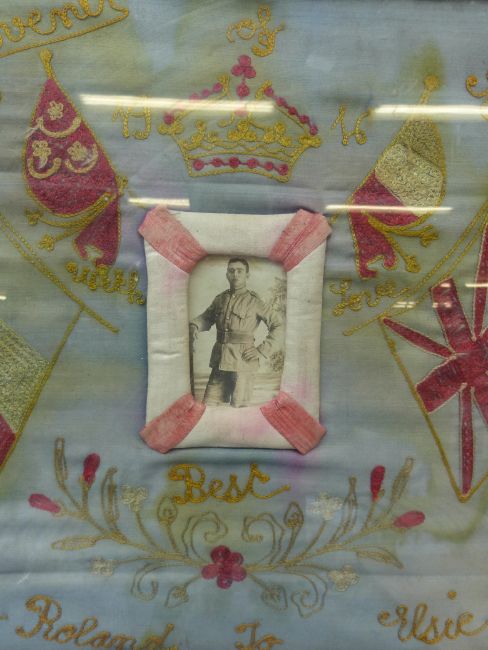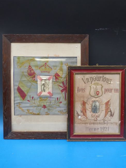 A framed and glazed WWI silk sampler with central photograph, flags etc "A Souvenir of Egypt 1916, with Love from Roland to Elsie" (possible Gloucester Regiment interest) together with a tapestry with central photograph and flags Berne 1921
