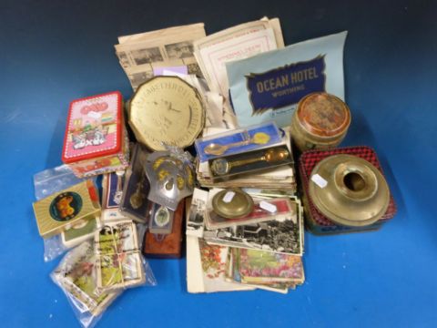 A collection of postcards, including game birds, gardens, countryside etc, theatre programmes, advertising tins, cased pens, brass inkwell etc