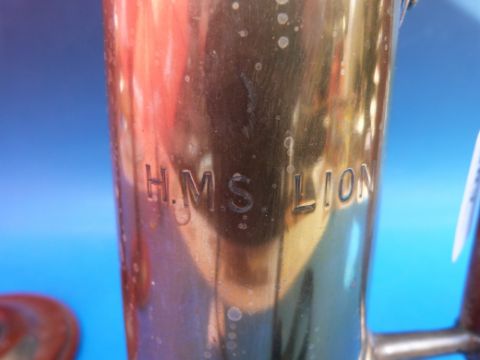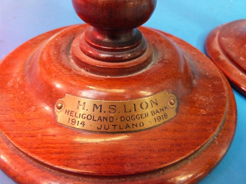 A Naval trench art tapering copper jug and a pair of barley twist mahogany candlesticks both HMS Lion, Admiral Beatty's flapship at the battle of the Jutland (The brass jug engraved HMS LION, the candlesticks with plaques)