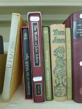 A selection of Folio Society titles including P G Wodehouse six title box set; The Worlds of John Aubrey; 2 x Travels with a Donkey and the quarter leather edition of The Old Curiosity Shop