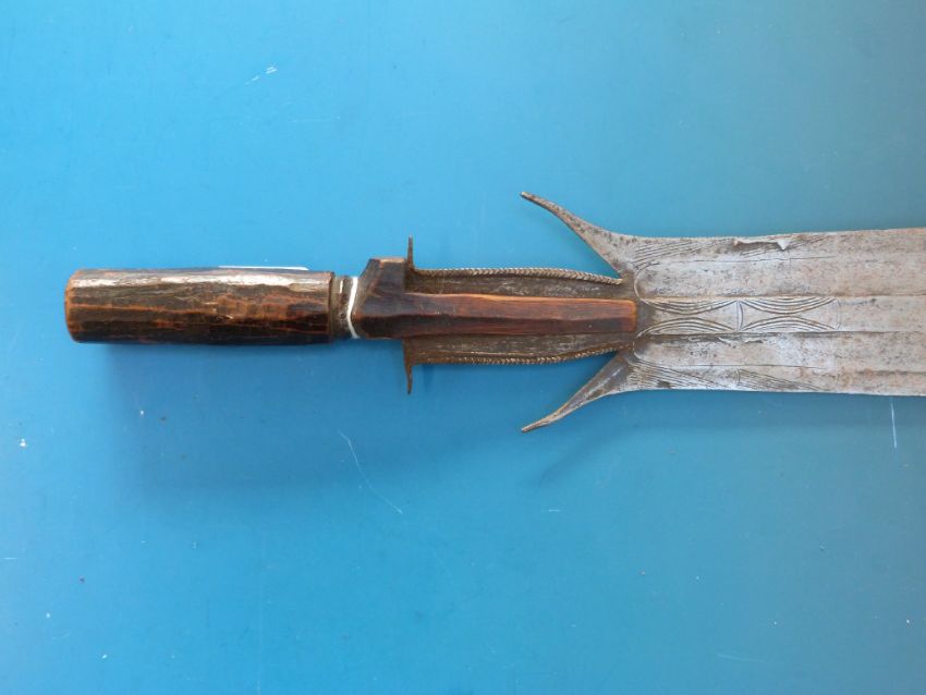 An Eastern (possibly Indonesian) double edged knife with wooden handle, length 62cm