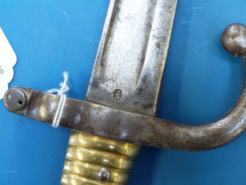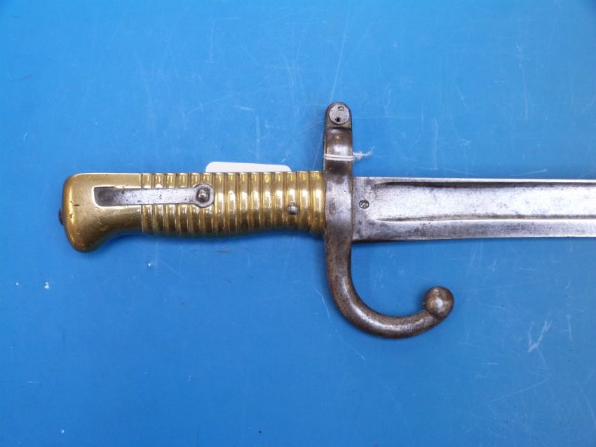 A French sabre bayonet with brass handle stamped T90947 marked to back of blade for 1871