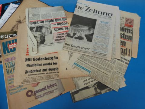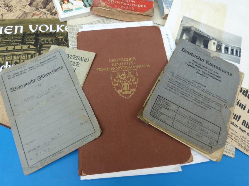 A quantity of German ephemera including WW2 content, passes, newspaper cuttings, Berlin Wall, moon landings etc, together with a Nazi propaganda book on German art, architecture, folk history etc, in the front of which has been added pictures and description of Buchenwald concentration camp (a sharp contrast to the book contents) together with a walkers map of Tripoli