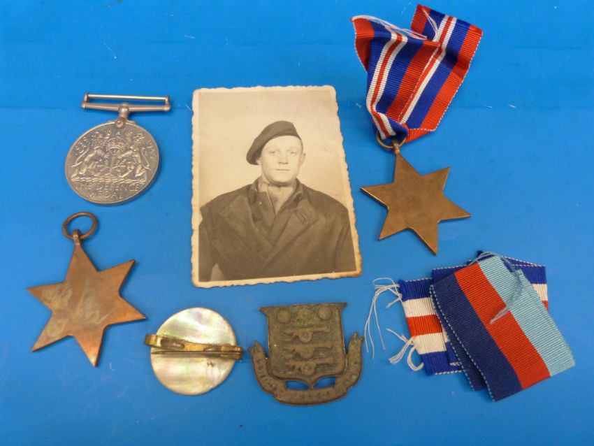 A group of three WWII medals in original box together with an Army Ordinance Corps plaque and sweetheart brooch