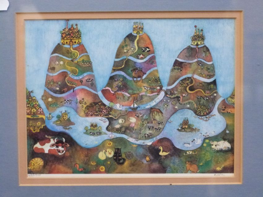 Fourteen various watercolours, prints and embroidered pictures of mainly floral and still life scenes.