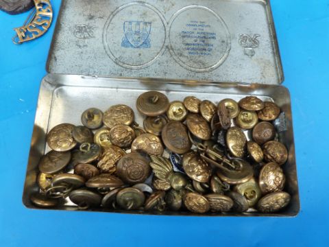 A framed display of 77 British military badges including cavalry, infantry and yeomanry units, Royal Scots Greys, Hampshire Tank Corps, X11th Lancers, Durham, Warwickshire etc including some reproduction items