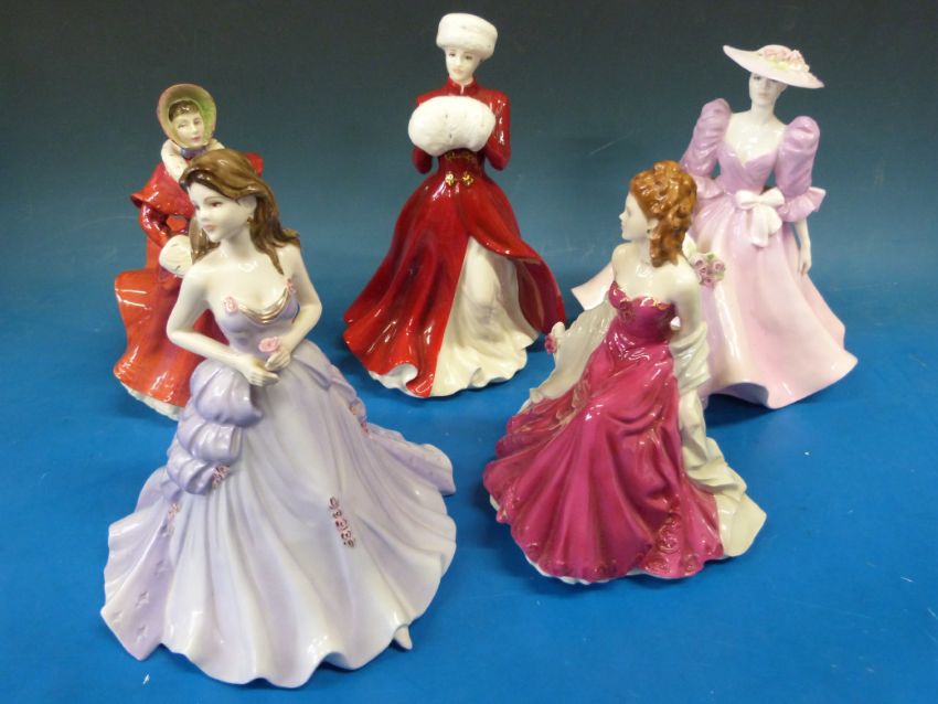 Two Coalport figures - "Barbara Ann" and "Happy Anniversary" together with two Royal Doulton figures "The Skater" (HN3439) and "A Winter's Morn" (HN4538) and a Royal Worcester figurine "Ruby Wedding Anniversary"