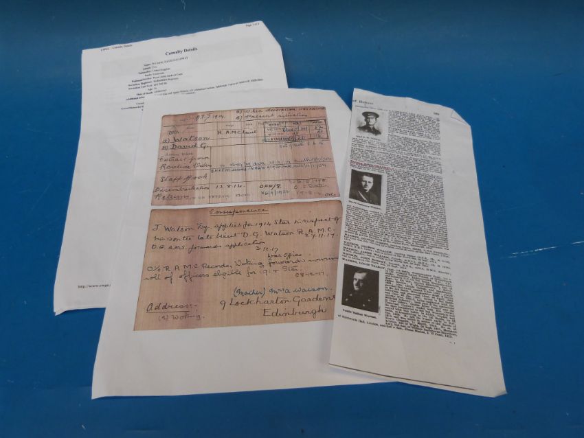A WW1 Star trio to Lt D G Watson RAMC together with a book written by him entitled 'Waiting Night Sketches' and copy of the Roll of Honour detailing Lt Watson's career and mentioning the book