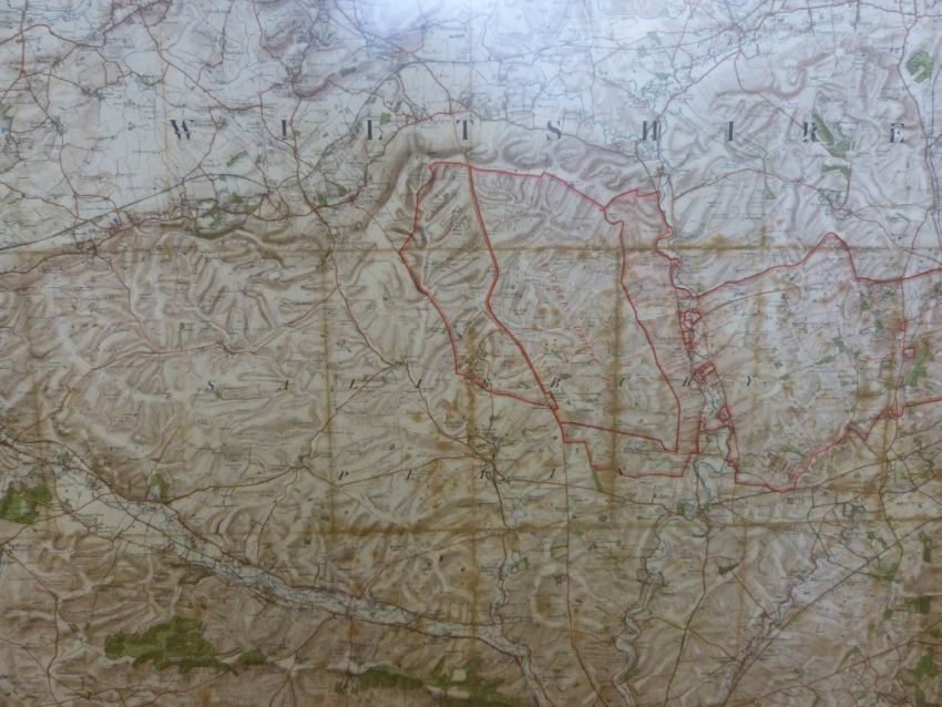 A red enamel war department 'Out of Bounds' triangular sign (height 59cm) together with a military map of Salisbury Plain