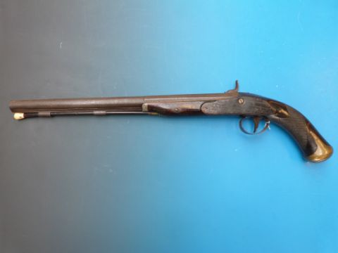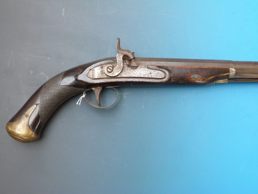 A very large percussion pistol converted from flintlock, with brass mounts, gold inlay, vacant cartouche, dolphin hammer and ivory tipped captive ramrod, c1800, approximately 66cm long