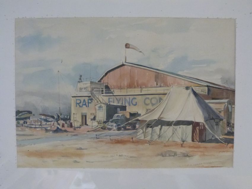 Watercolour of an RAF Flying Corps base "Just Outside Cairo in 1943". Painted by a friend of the vendor's father, who served at the base (24 x 35cm)