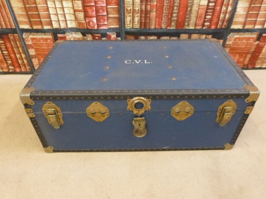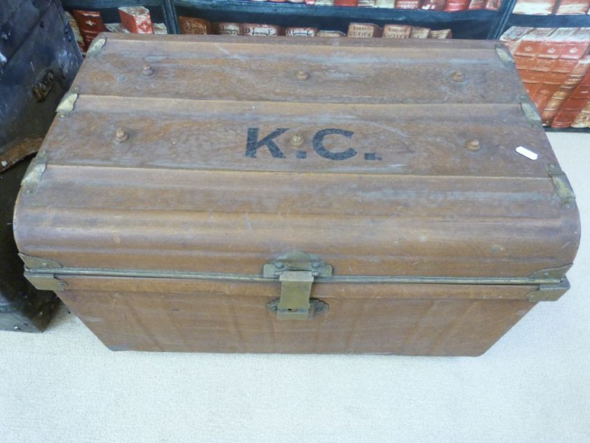Three various vintage trunks (metal, fibre and a wooden example)