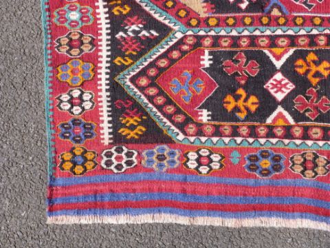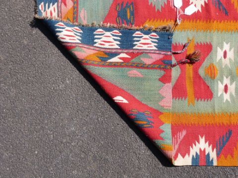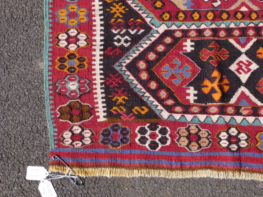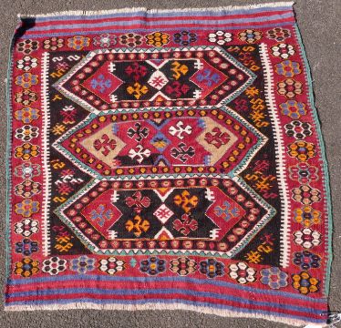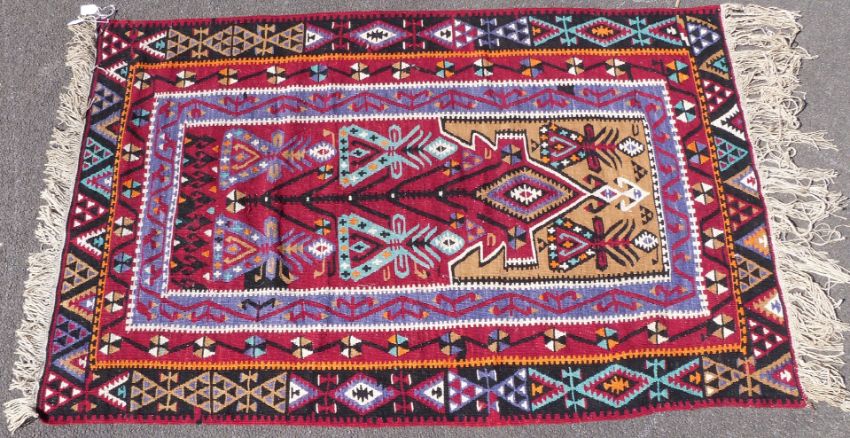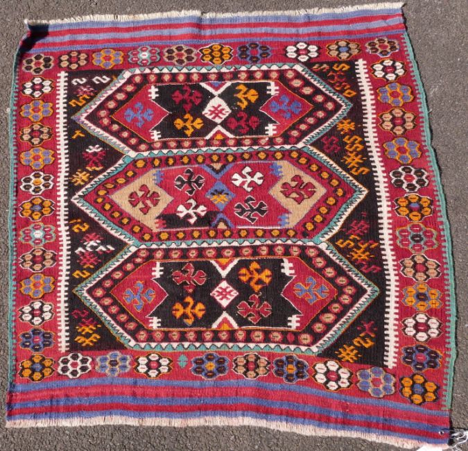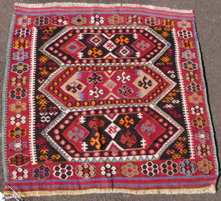 Three large kilim rugs and two square rugs (largest 195 x 109cm)