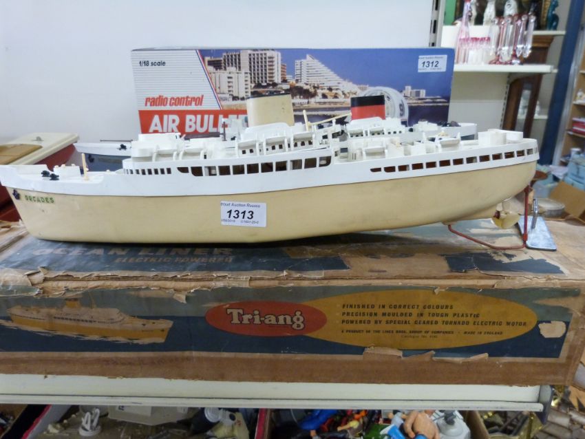 A boxed Tri-ang cargo ship MS Ocean Merchant with clockwork movement together with another electric powered ocean liner