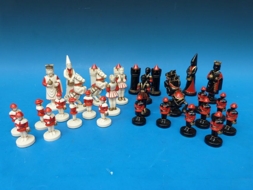 A bakelite / early plastic hand-decorated medieval "knights" chess set in box