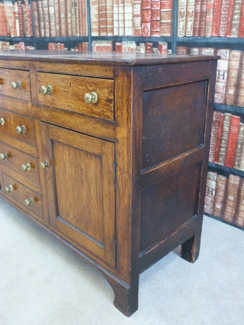 A Georgian oak "Lancashire" dresser base, fitted three drawers to the top and three drawers flanked by two cupboards below, with brass handles and inlaid boxwood escutcheons (W154cm, D50cm, H92cm)