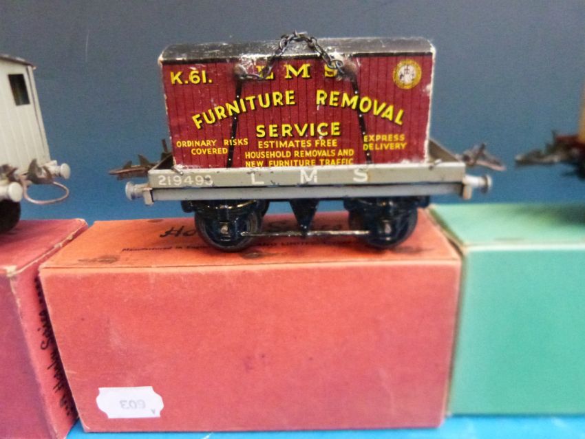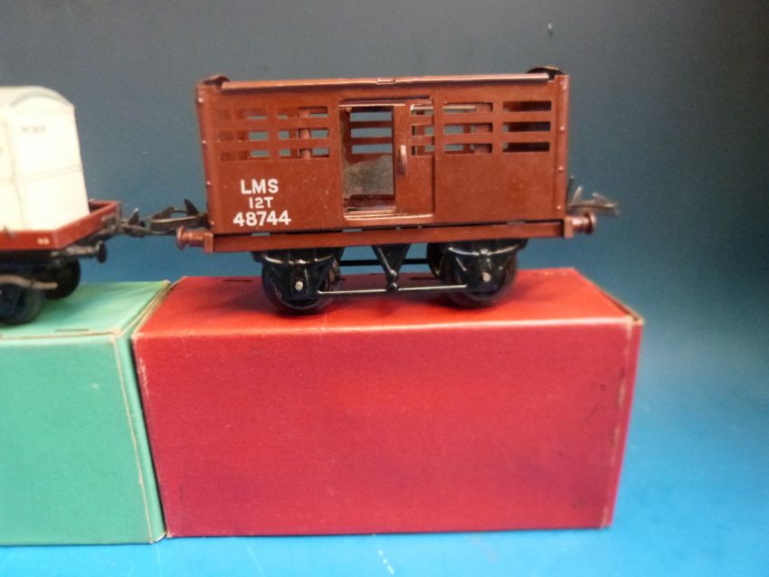 Four Hornby 0 gauge trucks, vans and wagons, an LMS brake van, a No 50 low-sided wagon, a flat truck with container and a No 1 cattle truck (all in original boxes)