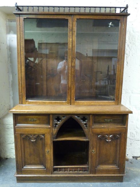 A Victorian oak Gothic bookcase, the top having glazed doors and adjustable shelves, the base having central shelf cubby hole flanked by drawer and cupboard to each side (W136, D51, H210cm)