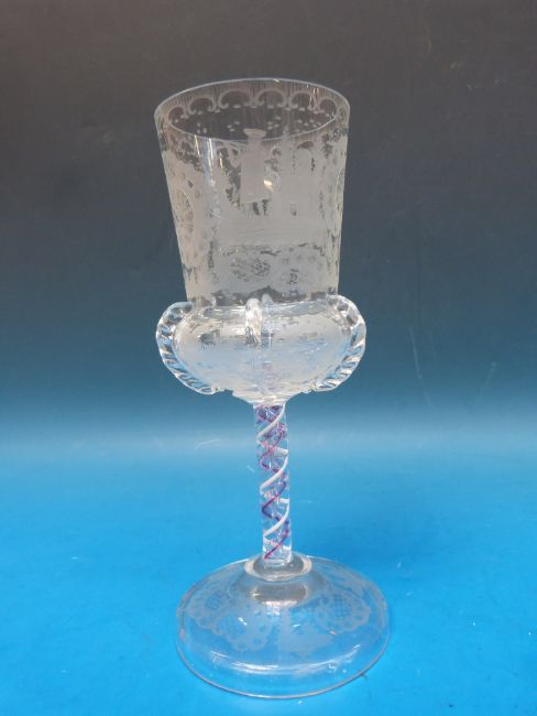 A 19thC Bohemian clear glass goblet etched to the body with hunting scenes among scrolling decoration, the lower half of the body with applied ribs, raised on a pink and white double twist stem and etched foot (21cm tall)
