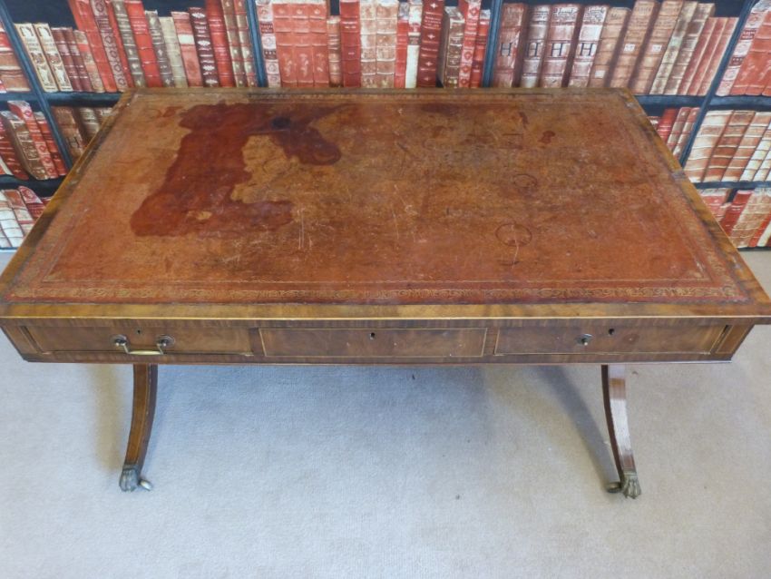 A 19th century style mahogany leather inset library table with three drawers to one side and false drawers to the other raised on splayed legs terminating in lions paw castors (W143cm, D88cm, H73cm)