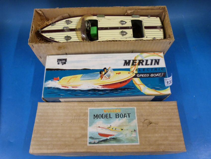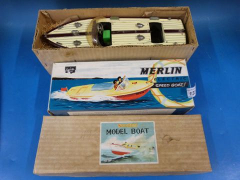 A Sutcliffe 'Merlin' electric boat in box together with a wooden hulled electric boat in box
