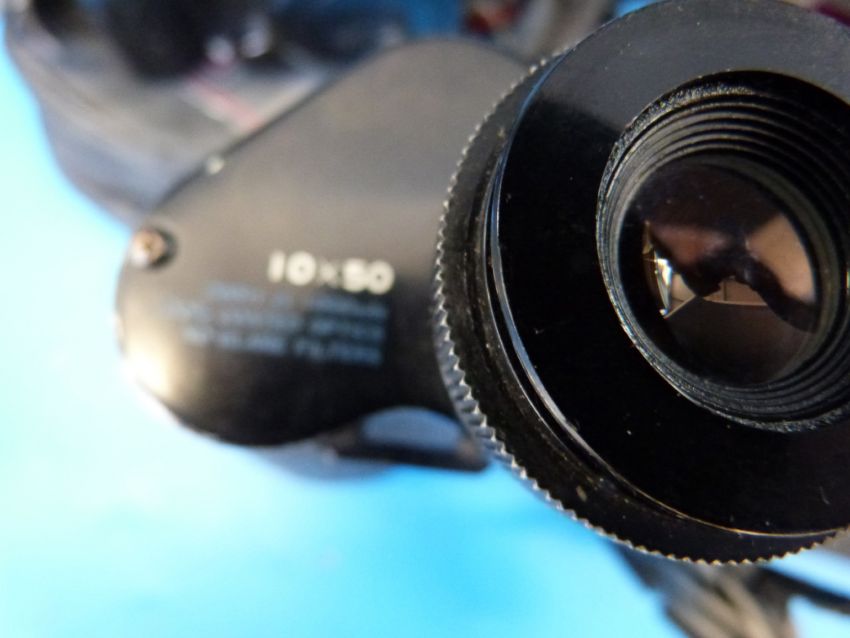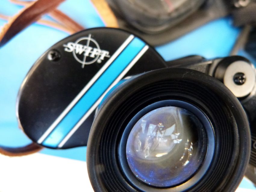 Three pairs of cased binoculars and various camera equipment