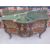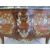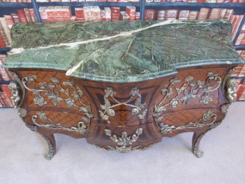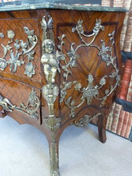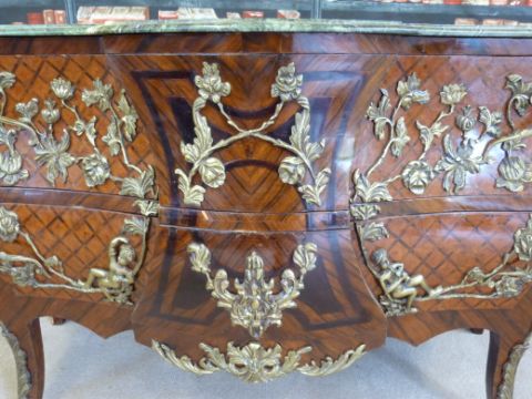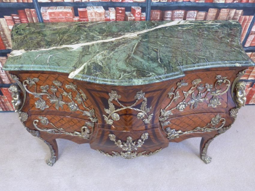 A Louis XV style kingwood parquetry inlaid bombe chest of two drawers with shaped and stepped front with floral and cherub decorated gilt mounts and marble top (W142cm, D64cm, H89cm)