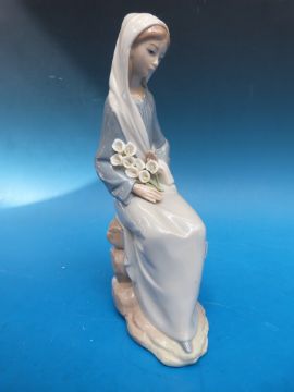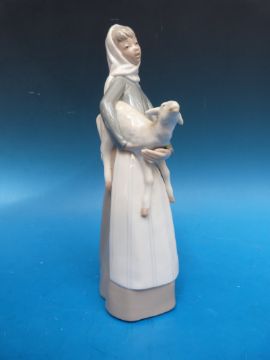 A group of four Lladro figures comprising a courting couple, a shepherdess, a girl with lilies and a girl with cockerel (tallest 27cm)