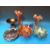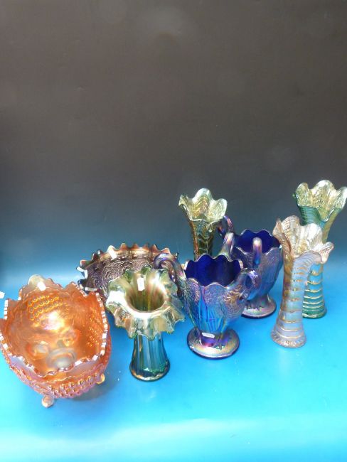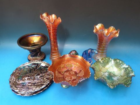 A collection of Carnival glass to include a pair of three handled swan vases, animals, pedestal bowl etc.