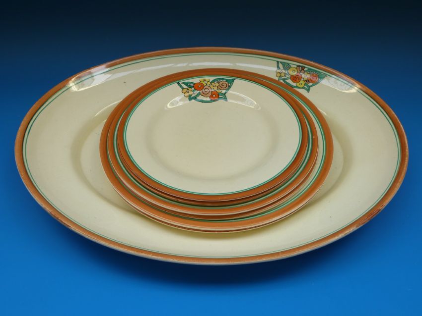 A Clarice Cliff honeyglaze meat plate and six graduated smaller plates (pattern 8275)