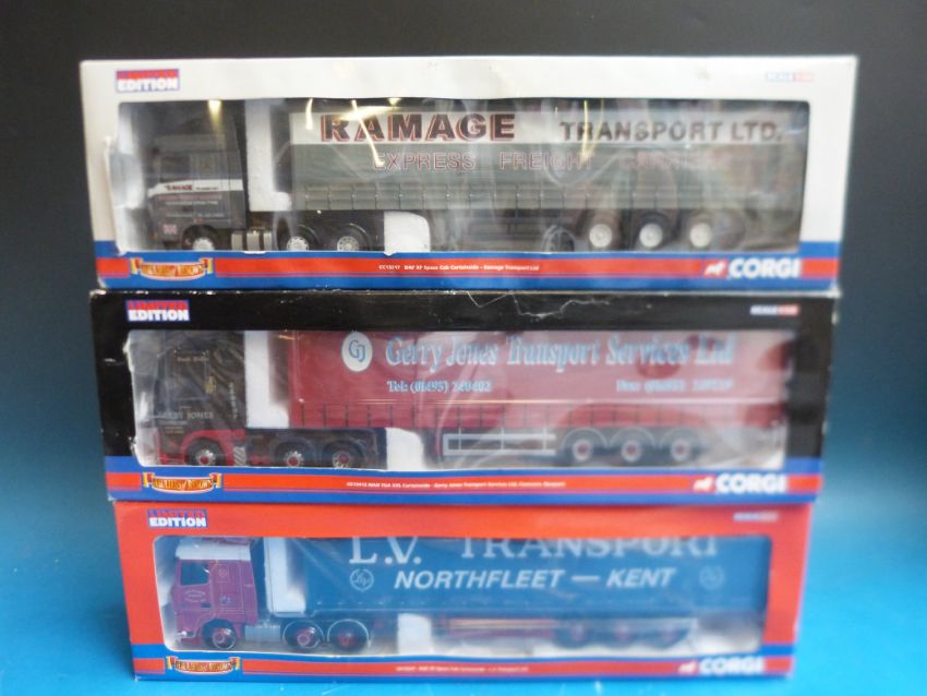 Three Corgi Hauliers of Renown 1:50 scale diecast model lorries Ramage cc13217, L.V. Transport cc13227 and Gerry Jones Transport Service Ltd cc13412 all in original boxes