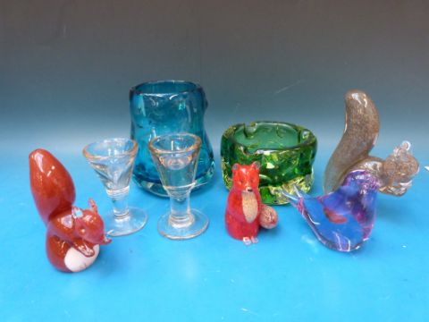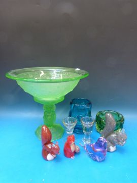Two pieces of Whitefriars glass together with three Langham animals, two penny lick glasses, a purple glass bird and Czechoslovakian pedestal bowl.