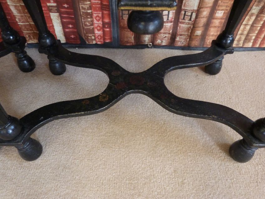 A pair of William and Mary style lacquer bureaux, the painted fall front opening to reveal a series of drawers and pigeon holes similarly painted with flowers, the base fitted two over one drawer, raised on tapering octagonal and turned legs united by a scrolling X shaped stretcher (W72cm, D44cm, H95cm)