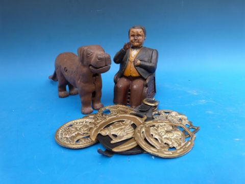 An American money box in the form of a politician pocketing money, together with a large nutcracker in the form of a dog etc (total weight 0.81kg)