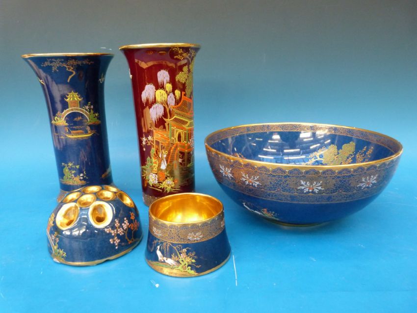 Five pieces of Carlton ware lustre decorated in the "Mikado" pattern, one on a red ground, the other blue (large bowl 23cm diameter)
