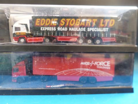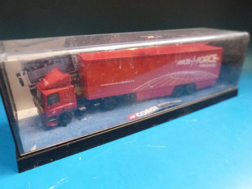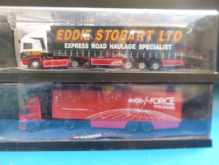 Three Corgi 1:50 scale diecast model lorries Eddie Stobart 75201, Richard Read 75203 and Parcel Force 75501 all in original boxes