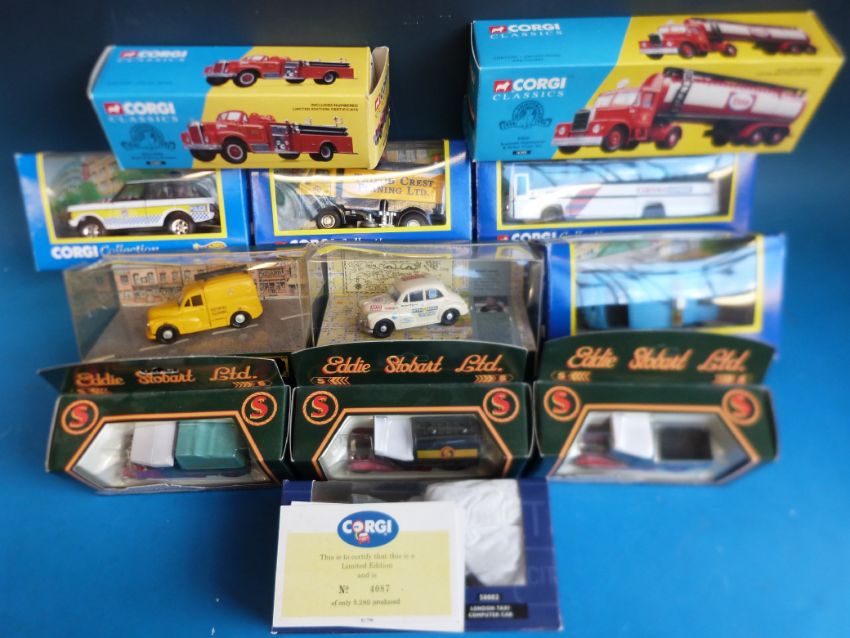 Twelve Corgi and Corgi Classics diecast model, cars, buses, lorries and emergency vehicles to include Eddie Stobart, London Scene etc (all in original boxes)