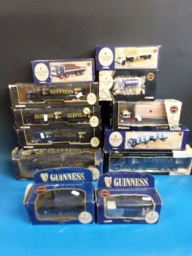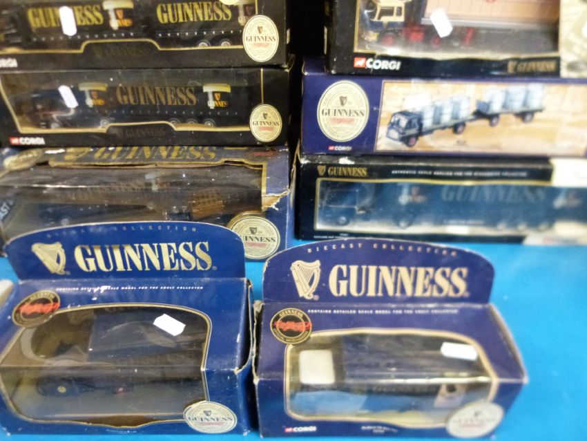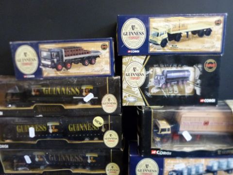 Twelve Corgi Guinness diecast model vehicles Volvo tanker 59530, Scania four wheel rigid lorry 59531, Leyland DAF Curtainside 7540, Bedford TK platform trailer 22504, ERF Curtainside 59529, Volvo rigid lorry and corner flatbed 59565, Leyland Bever platform lorry 24901, Scammell Scarab 15007 AEC MKV Mammouth Major tanker 26701 Bedford TK box van 22704 and Leyland Ergomatic 8 wheel platform lorry 20902, Bedford 22503 all in original boxes