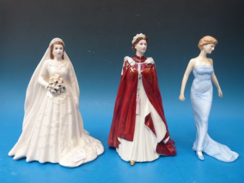 Royal Worcester 'Queen Elizabeth' figurine (80th Birthday) and another as a bride together with a Royal Doulton 'Princess Diana'
