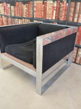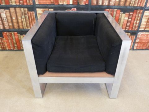 A stainless steel framed three-seater sofa and single armchair, originally designed for Anoushka Hempel of Blakes Hotel