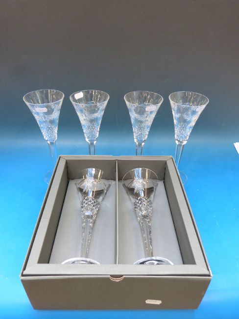 A set of 12 Waterford Crystal Millennium Collection toasting flutes / wine glasses in the Peace pattern 23.5cm tall and in original boxes.