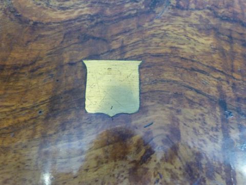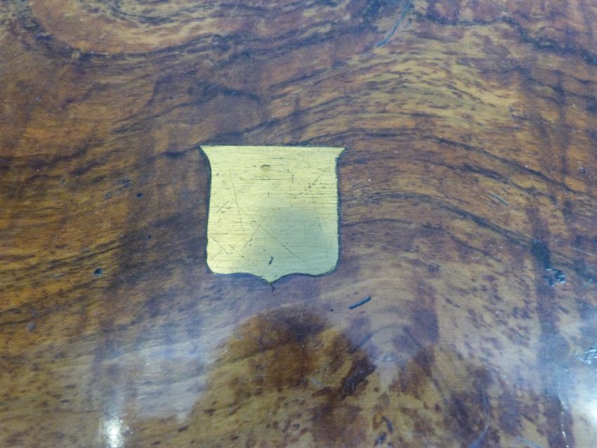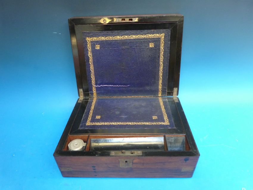 A late Victorian burr walnut work box with brass corner mounts and writing slope