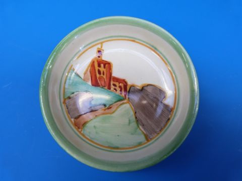 Two Clarice Cliff pin dishes, decorated in landscape patterns