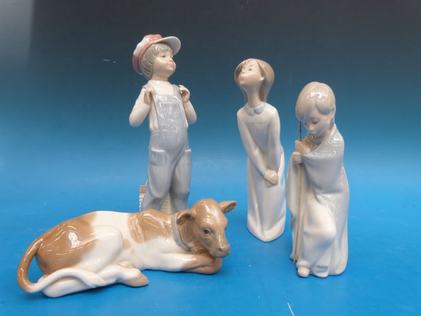 Lladro figurines Camison, Angel, Nino Chulin and Becceritio (a cow), most boxed, tallest 22cm