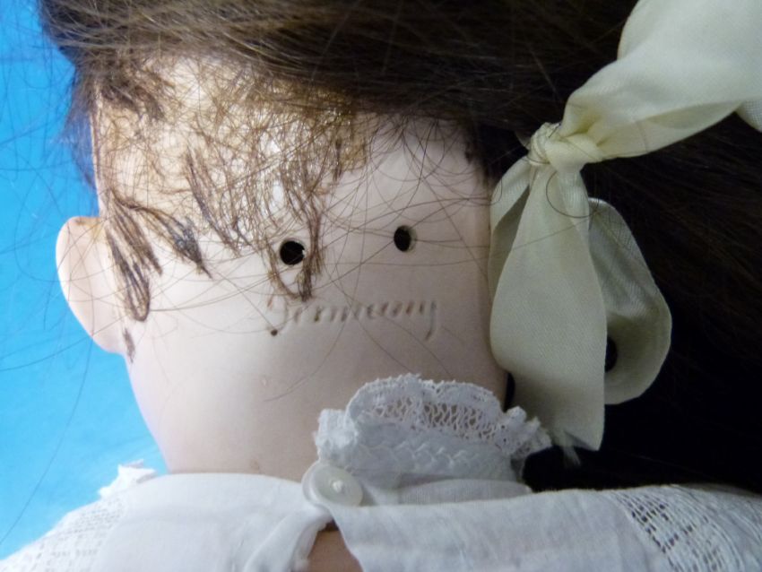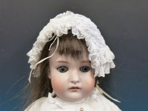A German bisque headed doll with open mouth, weighted blue eyes and long brown hair. Marked to the back of the neck Germany 13, dressed in full length white dress (64cm tall)