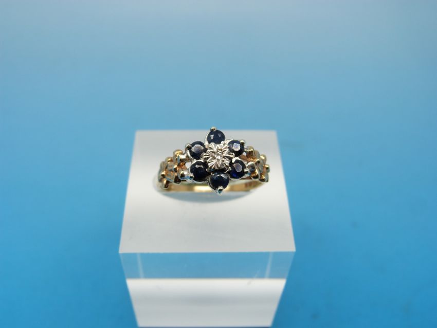 A 9ct gold ring set with a central diamond surrounded by sapphires in a flower cluster