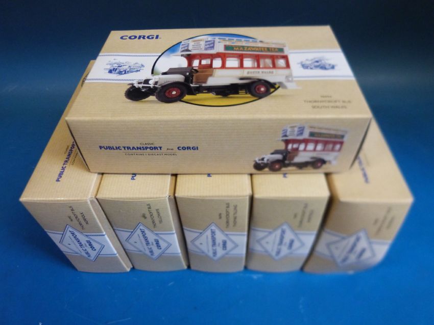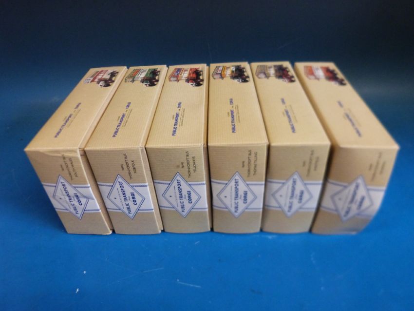 Six Corgi diecast model Thornycroft buses from the public transport range, all in original boxes