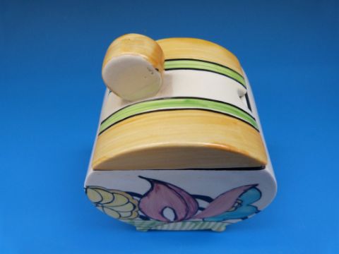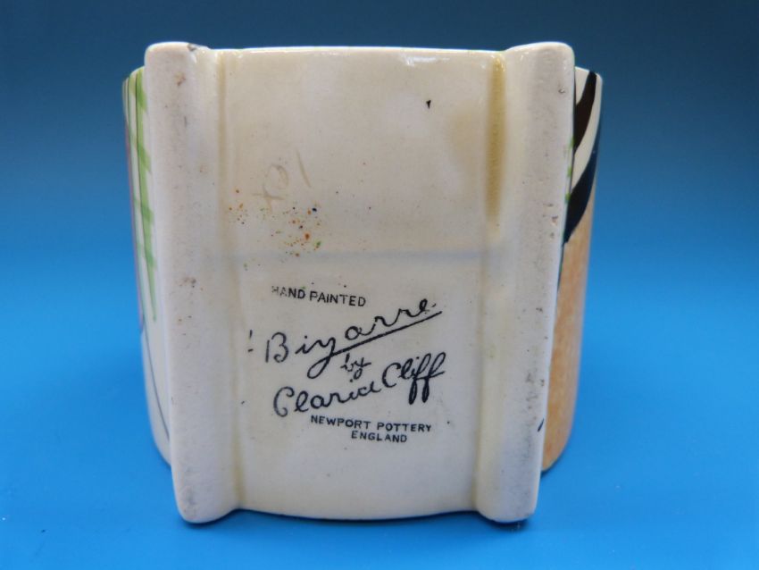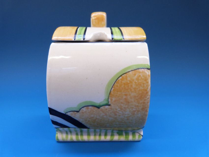 A Clarice Cliff Bonjour shaped preserve pot, decorated with flowers and trees