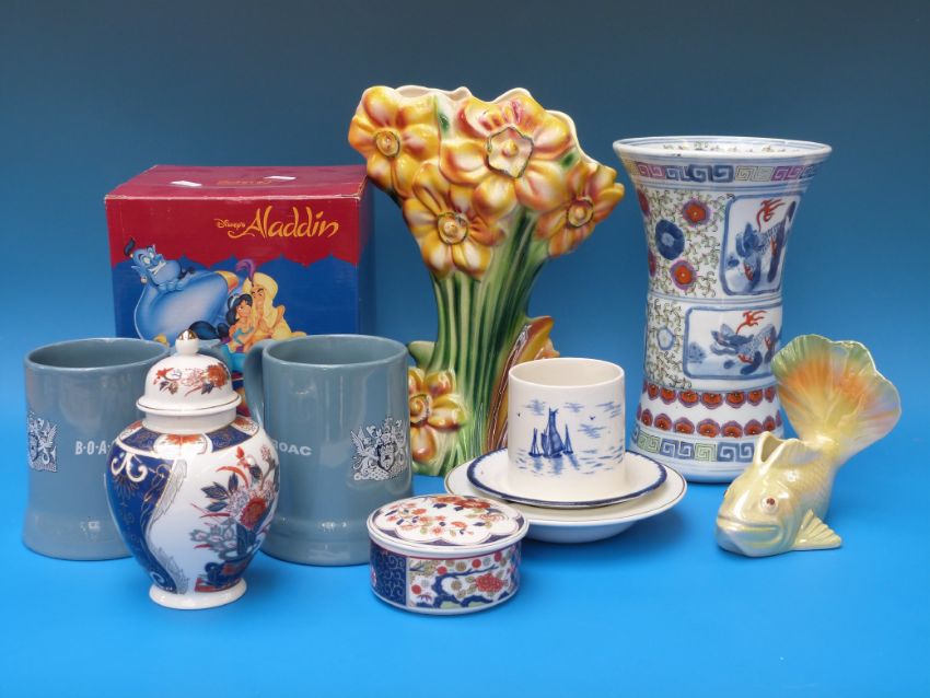 A collection of various ceramics to include Kalmar vase Wade tankards, Schmid Disney Aladdin globe, Wembley ware fish etc